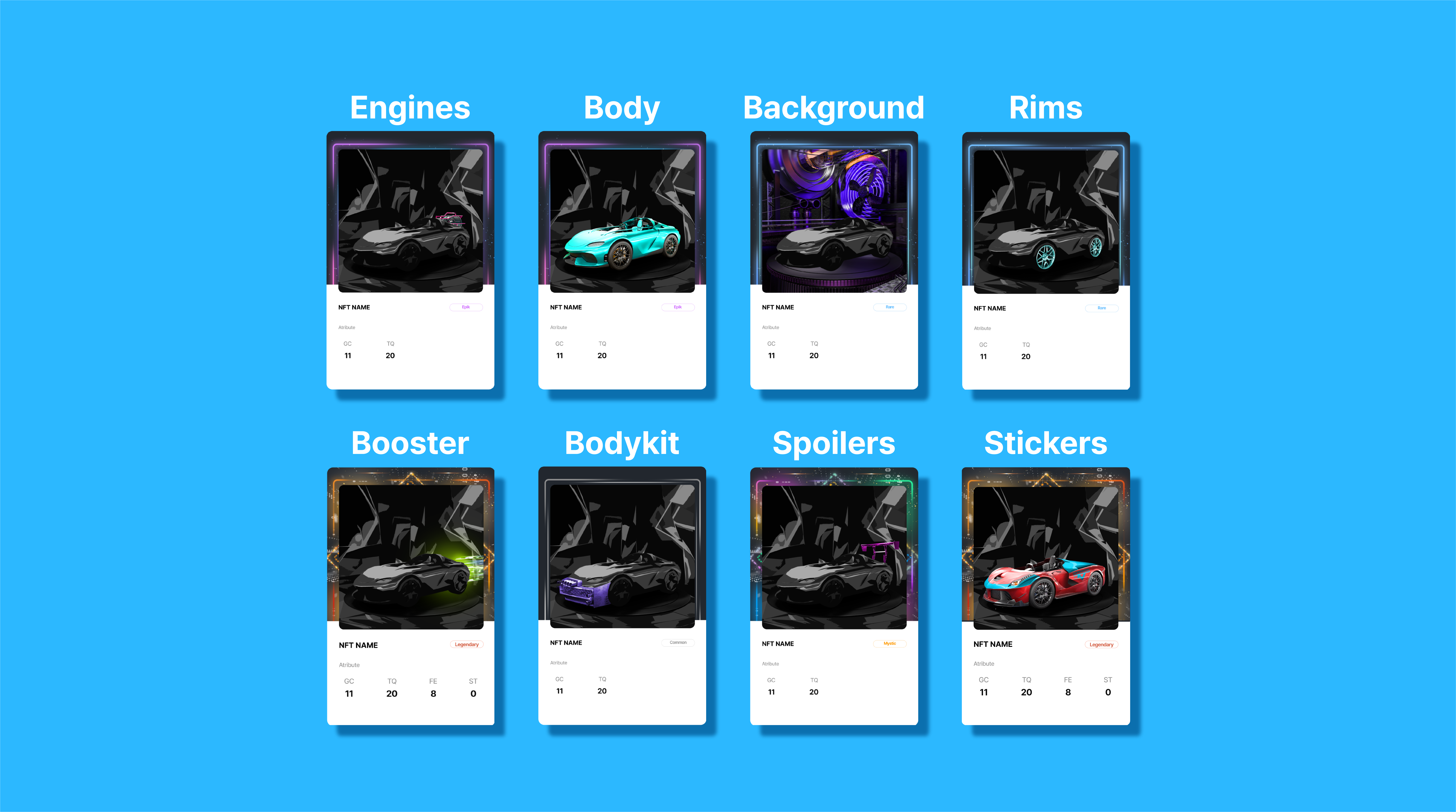 <table><thead><tr><th width="194">Item Parts Grades</th><th>NFT Grades</th></tr></thead><tbody><tr><td>Body</td><td>Common / Rare / Epic / Legendary / Mystic</td></tr><tr><td>Background</td><td>Common / Rare / Epic / Legendary / Mystic</td></tr><tr><td>Engine</td><td>Common / Rare / Epic / Legendary / Mystic</td></tr><tr><td>Booster</td><td>Common / Rare / Epic / Legendary / Mystic</td></tr><tr><td>Wheel</td><td>Epic / Legendary / Mystic</td></tr><tr><td>Body Kit</td><td>Epic / Legendary / Mystic</td></tr><tr><td>Spoiler</td><td>Epic / Legendary / Mystic</td></tr><tr><td>Sticker</td><td>Epic / Legendary / Mystic</td></tr></tbody></table>
